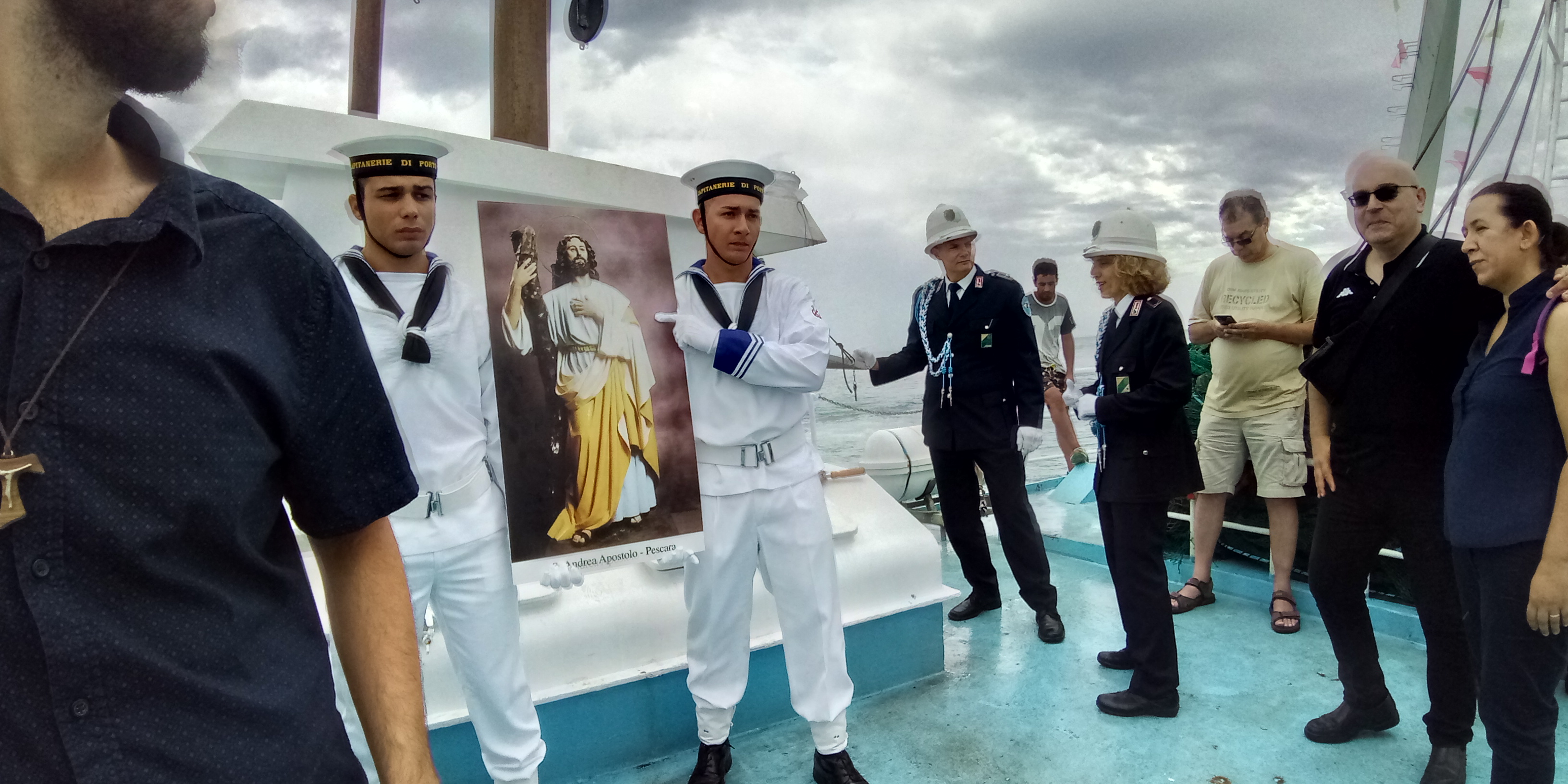 Una processione a metà quella di oggi a causa del maltempo. Infatti, è stato deciso di non fare uscire in mare la statua del Santo che rischiava danni ma solo l’effigie. Seppur commovente come sempre, soprattutto il lancio delle corone in mare per ricordare i pescatori che non ci sono più, Pescaresi e parte della marineria sono rimasti un po’ delusi dalla mancanza della statua sul motopesca Fabio. Uno degli storici organizzatori, Riccardo Padovano, ha asserito che non si poteva fare diversamente causa pioggia, tanto che nemmeno le barche sono uscite ma solo alcune. Altri storici armatori, come Mimmo Grosso reputano che la statua non sia totalmente di cartapesta e sarebbe potuta uscire magari con una copertura. Altri ancora si sono chiesti perché non posticipare la processione domani ma sembrava una soluzione impossibile visto che, spiegano gli organizzatori, si è sempre svolta di domenica, anche se c’è qualcuno che ricorda almeno un lunedì. Tant’è si spera che il Santo amato da pescatori e Pescaresi possa dirimere le polemiche perché il mare unisce non divide. Intanto la festa prosegue e domani notte la chiusura con i tradizionali fuochi a mare.