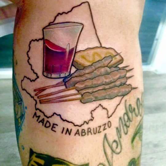 Un tatuaggio a dir poco originale quello scelto da un giovane pescarese che si è trasferito a Rimini per lavoro: arrosticini e vino impressi e disegnati sulla pelle. Un modo, dice Marco Di Michele, questo il suo nome, sulla pagina facebook dedicata, manco a dirlo, agli Arrosticini, per portare i sapori abruzzesi sempre con lui. La foto del tatuaggio è stata condivisa sui social dagli Abruzzesi sparsi per il mondo, fino a Singapore. Migliaia di condivisioni del singolare tatuaggio che di certo non passa inosservato. L’arrosticino diventa una moda anche sulla pelle? Un marchio del made in Abruzzo che più marchio non si può! D’altronde un tatuaggio è per sempre …