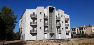 L’edificio di tre piani, è suddiviso in 12 appartamenti tra i 60 e gli 80 metri quadri. Al piano terra sono stati realizzati 12 box auto.