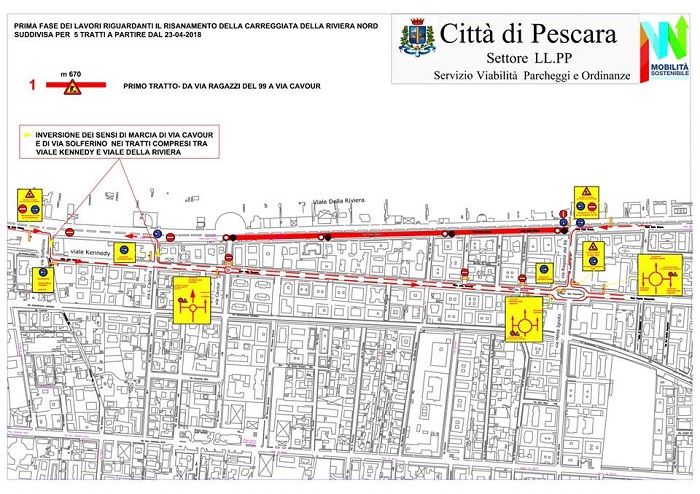 “Riparte da via Cavour il cantiere per la posa del manto di asfalto sul tratto risanato della riviera nord dalla rotonda Paolucci alla Madonnina. Come abbiamo già ampiamente annunciato, oggi saranno di nuovo interdetti traffico e sosta il tratto da via Cavour fino a via Ragazzi 99. Gli interventi, dopo la fase di risanamento della sede stradale, ora prevedono la fresatura, il livellamento centrale della strada e la posa del nuovo manto di asfalto per tutta la sede stradale. Dalle 7 di oggi, lunedì, è scattato così il divieto di transito e sosta sul primo tratto (via Cavour-via ragazzi del 99) e se lunedì il lavoro sarà finito si passerà al tratto successivo (via Ragazzi del 99- viale Muzii) già martedì mattina. La segnaletica stradale precederà l’avanzare dei lavori in modo da poter avvisare in tempo utile residenti e fruitori del tratto interessato e la ditta addetta alla segnaletica, operativa già nella prima mattinata di lunedì, provvederà a integrare i divieti a valere per il giorno successivo anche sul secondo tratto. Scattano oggi, lunedì, anche le inversioni di marcia su via Cadorna (che sarà monti-mare) e via Solferino (che sarà mare-monti)”.