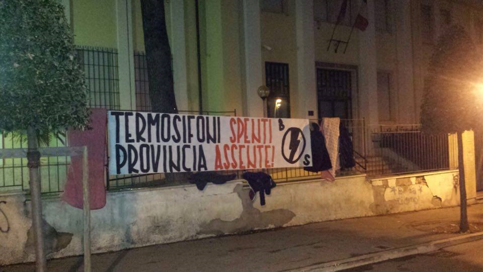 “Termosifoni spenti, Provincia assente”, è questo il testo dello striscione con il quale il Blocco Studentesco protesta a Lanciano contro la mancata accensione o il funzionamento ad intermittenza del riscaldamento al Liceo Classico “Vittorio Emanuele II”, al Liceo Scientifico “Galileo Galiei” e all’I.T.E.T. “Enrico Fermi”. Nella notte coperte, sciarpe e cappotti sono stati appesi presso gli istituti superiori cittadini per “riscaldare” gli stabili, in cui i termosifoni sono spenti, o funzionanti fino ad un certo orario a dispetto del clima rigido di questi giorni.
