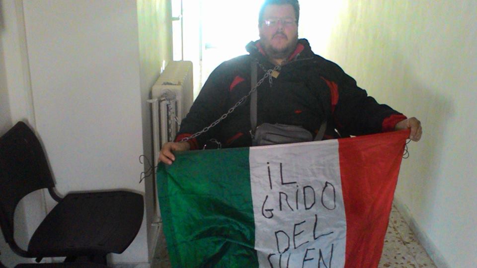 Una storia difficile quella di Paolo De Titta, 40 anni, di Sant’Esanio del Sangro: diabetico e invalido civile da quando aveva 10 anni, è stato operato più volte ai piedi a causa della sua patologia, e l’ultimo intervento lo ha subito nel novembre scorso per osteomielite. Ora ha difficoltà a camminare e per questo si muove su una sedia a rotelle, vive con la madre e due fratelli, uno dei quali con problemi epatici. Sia Paolo che il fratello hanno la pensione di invalidità: 280 euro mensili. La madre è stata vittima di una brutta caduta ed ha comunque bisogno di assistenza. Ogni martedì e giovedì pomeriggio, Paolo si incatena in Comune e chiede di essere ricevuto dal sindaco di Sant’Eusanio del Sangro. Dice che non ha i soldi per acquistare pasti per diabetici e che rischia di restare senza cibo perché non può mangiare alimenti che non siano indicati per la sua patologia. Paolo De Titta mostra la bandiera tricolore con su scritto “Il grido del silenzio”, chiede l’attenzione delle Istituzioni e si fa portavoce delle altre persone nelle sue stesse condizioni. De Titta non demorde e si mostra incatenato al termosifone degli uffici del Comune di Sant’Esanio del Sangro, dove ormai, volenti o nolenti, per amministratori e frequentatori del Municipio, è diventato di casa.