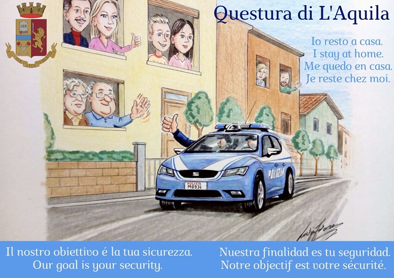 “Arrestiamo il Covid 19. Il nostro obiettivo è la tua sicurezza”: è questo lo slogan della campagna di sensibilizzazione portata avanti dalla Questura di L’Aquila con la vignetta “Io resto a casa” e l’appello alla responsabilità sociale, tradotto in più lingue per veicolare un messaggio in questo momento universale.