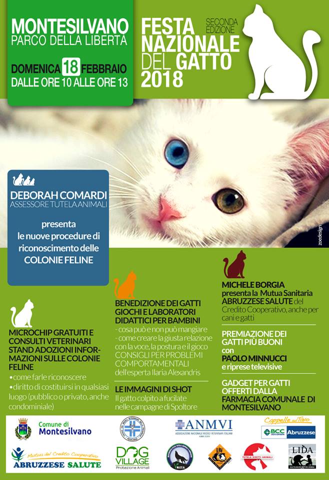 Dalle 10 alle 13 le Associazioni Dog Village, Lav, Lida, Meta e Tutela Diritti Animali, festeggeranno tutti i gatti che per l’occasione potranno essere microchippati gratuitamente. Nel corso della mattinata verranno organizzati giochi e laboratori didattici per i bambini, incontri formativi sull’alimentazione dei gatti e su come creare giuste relazioni anche attraverso voce, postura e tipi di gioco proposti ai gatti. Sarà presente Ilaria Alexandris, esperta di gatti che fornirà consigli per i problemi comportamentali del gatto. Sarà allestito anche uno Stand della BCC di Cappelle su Tavo. Saranno regalati gadget per tutti i gatti, offerti dalla Farmacia Comunale di Montesilvano. Il giornalista Paolo Minnucci condurrà la premiazione del gatto più buono, con riprese televisive. La manifestazione è patrocinata dal Comune di Montesilvano, dall’Ordine dei Veterinari e dall’Associazione Nazionale Medici Veterinari.