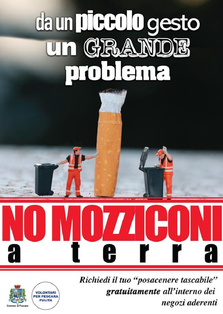 È stato riscontrato come un mozzicone senza filtro impieghi dai 6 ai 12 mesi per deteriorarsi; addirittura, nel caso dei mozziconi con filtro, questa forbice temporale è compresa tra i 5 e i 12 anni. Se si tiene conto del fatto che in un anno vengono dispersi nell’ambiente in Italia da 13 milioni di fumatori ben 72 miliardi di mozziconi, si potrà ben immaginare la dimensione di un fenomeno che, anche a Pescara, non è certo assente.