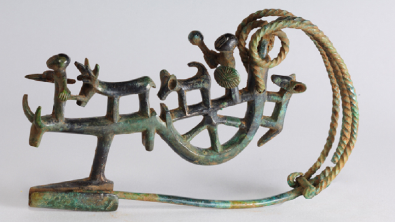 Questa fibula ha un arco configurato, su cui è rappresentato un carro, trainato da un bovide dalle lunghe corna. Sul dorso del bue vi è una figurina umana rappresentata con le gambe separate, le braccia allargate e le mani segnate dall’incisione delle dita: con la destra impugna una corta lancia e con la sinistra guida un cervo adulto con il muso stretto dal laccio. Sul carro si susseguono un cane con le orecchie dritte e la coda rivolta verso il dorso, ed una seconda figura in posizione dominante, con uno scudo decorato e con uno scettro; all’esterno del carro, in verticale sulla parte posteriore della ruota, è raffigurato un altro cane con la coda abbassata. Le figure umane hanno teste massicce, oblunghe, recanti incisioni parallele. Della rappresentazione sono state date diverse interpretazioni: potrebbe trattarsi di una scena di caccia al cervo, ma il carro trainato dal bue potrebbe anche alludere al viaggio del defunto verso l’oltretomba in una sorta di sfilata cerimoniale con un intento di “eroizzazione” del personaggio. In alternativa, è possibile leggere la scena come un sacrificio in cui il sacerdote scaccia i demoni e i mali percuotendo lo scudo con la mazza. La fibula in bronzo è stata rinvenuta nella tomba 45, ospitata all’ interno di un grande tumulo funerario. La tomba, maschile in base agli altri oggetti di corredo, doveva appartenere ad una figura eminente della comunità seppellita nella necropoli.