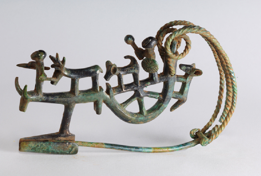 Questa fibula ha un arco configurato, su cui è rappresentato un carro, trainato da un bovide dalle lunghe corna. Sul dorso del bue vi è una figurina umana rappresentata con le gambe separate, le braccia allargate e le mani segnate dall’incisione delle dita: con la destra impugna una corta lancia e con la sinistra guida un cervo adulto con il muso stretto dal laccio. Sul carro si susseguono un cane con le orecchie dritte e la coda rivolta verso il dorso, ed una seconda figura in posizione dominante, con uno scudo decorato e con uno scettro; all’esterno del carro, in verticale sulla parte posteriore della ruota, è raffigurato un altro cane con la coda abbassata. Le figure umane hanno teste massicce, oblunghe, recanti incisioni parallele. Della rappresentazione sono state date diverse interpretazioni: potrebbe trattarsi di una scena di caccia al cervo, ma il carro trainato dal bue potrebbe anche alludere al viaggio del defunto verso l’oltretomba in una sorta di sfilata cerimoniale con un intento di “eroizzazione” del personaggio. In alternativa, è possibile leggere la scena come un sacrificio in cui il sacerdote scaccia i demoni e i mali percuotendo lo scudo con la mazza. La fibula in bronzo è stata rinvenuta nella tomba 45, ospitata all’ interno di un grande tumulo funerario. La tomba, maschile in base agli altri oggetti di corredo, doveva appartenere ad una figura eminente della comunità seppellita nella necropoli.