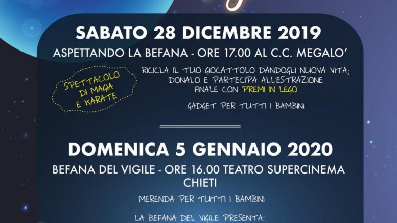 L’appuntamento è organizzato dalla polizia municipale diretta dalla comandante Donatella Di Giovanni, in collaborazione con l’Anvup, l’Associazione nazionale vigili urbani in pensione, sezione di Chieti. La manifestazione è dedicata alle famiglie e in particolare ai più piccini ai quali la Befana porterà i suoi doni. L’evento in programma a partire dalle ore 16 con ingresso gratuito, parte con una merenda offerta a tutti i bambini. A seguire ci sarà lo spettacolo presentato da Perrotta. A seguire l’ estrazione della lotteria a premi il cui ricavato sarà interamente devoluto a favore del progetto “Un sogno che continua- Onlus Il Tratturo”. Un modo per dare un sostegno concreto alle tante famiglie che si recano a Milano dal Professor Veronesi. Al termine della manifestazione, il corpo di polizia municipale e la Befana dei vigili saluteranno i bambini con la consegna delle calze colme di caramelle e dolcetti.