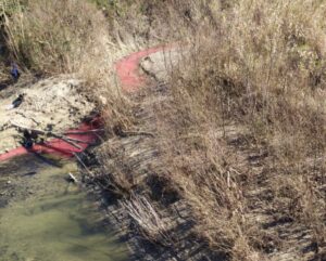 La segnalazione di una chiazza di color rosso nelle acque del fiume Saline a Montesilvano è giunta stamani al Comando della Polizia Municipale. (Foto)