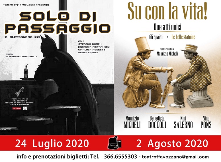 Il 24 luglio si ricomincerà nel cortile della scuola media Fermi di Avezzano (AQ) con lo spettacolo “Solo di passaggio” di Alessandro Izzi. Il 2 agosto invece sarà la volta di “Su con la vita” di e con Maurizio Micheli, che sostituirà “Croce e delizia, signora mia…” di e con Simona Marchini e Paolo Restani.