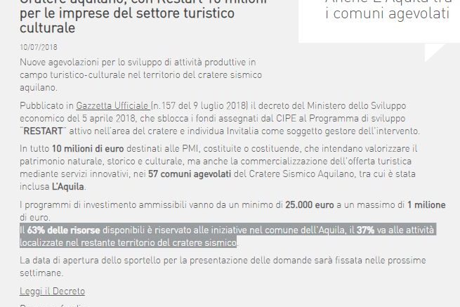 E’ il bando noto come Invitalia, che nei mesi scorsi ha già finanziato progetti imprenditoriali nei piccoli Comuni. Ora si attendeva il bando che avrebbe portato risorse per gli imprenditori del turismo dell’Aquila. Ma il ministro dello Sviluppo economico Luigi Di Maio, come spiega il presidente vicario della Regione Abruzzo Giovanni Lolli, lo ha sospeso, per poter verificare una per una tutte le voci. Le agevolazioni avrebbero dovuto riguardare i programmi di investimento indirizzati a creare nuove imprese o ampliare e riqualificare imprese esistenti e avere per oggetto la valorizzazione turistica del patrimonio naturale, storico e culturale, ma anche quelli per la creazione di micro-sistemi turistici integrati con accoglienza diffusa e per la commercializzazione dell’offerta turistica attraverso progetti e servizi innovativi.
