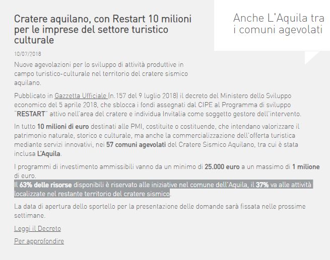 Bando Invitalia per il programma “Restart” per il turismo: tutto bloccato. Per ora non se ne parla di far partire lo stanziamento assegnato dal Cipe nell’ambito del Programma di sviluppo dell’area del cratere aquilano.