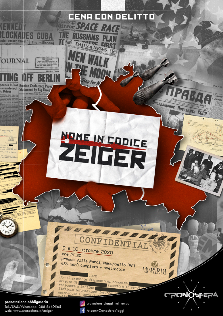 Dopo la pausa dovuta al lockdown, gli attori di Cronosfera sono pronti a tornare sul palco o, per meglio dire, nei migliori ristoranti abruzzesi. In questi mesi l’associazione culturale di Pescara, che riunisce attori, scrittori, game-designer e registi, non si è fatta scoraggiare e ha lavorato sodo su una nuova Cronocena con delitto: “Nome in codice Zeiger”, che debutterà il 9 e 10 ottobre alle 20.30 a Villa Pardi.