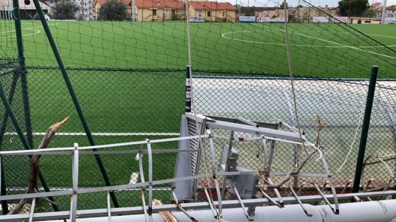 A Vasto a causa del forte vento è crollata la torre faro del campo sportivo San Paolo. Il palo in metallo alto circa 15 metri si è schiantato sulla tribuna. Il palo cadendo ha danneggiato le gradinate dell’impianto sportivo, interessata anche la recinzione del campo in erba sintetica. Distrutta anche una delle panchine a bordo campo. L’episodio si è verificato poco dopo le 20,30 e fortunatamente a quell’ora nessuno era presente nella struttura. Sul posto sono intervenuti i Vigili del Fuoco per mettere in sicurezza l’intera area.