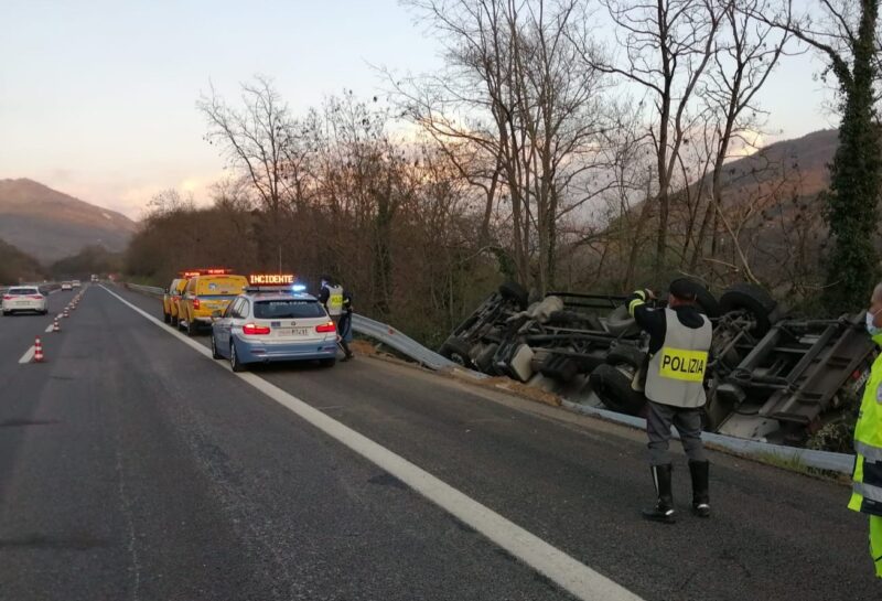 Incidente lungo l’Autostrada A/24, un autoarticolato perde il controllo e si ribalta. La Polizia Stradale soccorre il conducente.