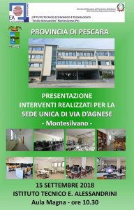 Il Presidente della Provincia di Pescara, Antonio Di Marco, ricorda inoltre che sarà unificata la sede dell’Istituto Tecnico Economico e Tecnologico “Emilio Alessandrini” di Montesilvano. Gli interventi realizzati per la sede unica in Via D’Agnese presentati presso l’Aula Magna.