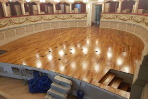 I lavori hanno riguardato tutto lo spazio del teatro, con l’obiettivo di realizzare nuovi percorsi e migliorarne accessibilità e fruibilità. È stato rimodulato tutto il sistema delle sedute dei palchi e della platea, anche inserendo dispositivi multimediali sugli schienali per consentire nuovi e diversi modi di avvicinarsi al mondo del Teatro. Le sedie di platea, completamente smontabili, consentiranno non solo di recuperare spazi per le carrozzine, ma anche di avere uno spazio versatile e adatto a modi diversi di fare spettacolo. Un nuovo pavimento in marmo portoro bicromo disposto a scacchiera inaugura l’ingresso e il nuovo parquet in legno della sala rinnova lo storico ambiente, richiamando l’eleganza e la ricchezza di un luogo magico per la città e per l’intera regione. A questo si affiancano opere più funzionali, dall’inserimento di un ascensore in cristallo, alla piattaforma elevatrice che consentirà a persone con ridotta abilità motoria di raggiungere e vivere anche il palcoscenico, fino alla messa in sicurezza dell’impalcato del palcoscenico e dei palchetti.