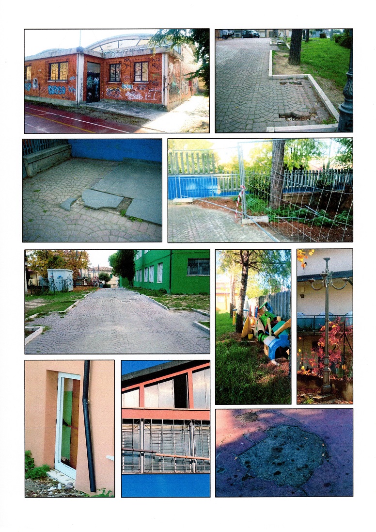 Dopo un sopralluogo effettuato in questi giorni, in tutta l’area vi sono segni evidenti di abbandono, trascuratezza e degrado oltre che il solito vandalismo: nell’area retrostante la scuola media si notano immondizia, erbacce e transenne di cantiere distrutte, all’interno dell’area scolastica sette panchine mancanti, panchine estirpate dalla sede a terra con mattonelle rotte, fioriere rotte e senza piante, tombini di scolo otturati da fogliame, la palestra in uso delle scuole con canali di gronda rotti, fili di corrente volanti non a norma e pericolosi, campetto di basket con pavimentazione rotta, aiuole completamente distrutte, palo di illuminazione con quattro lampioni rotti, area retrostante la scuola materna con erbacce e giochi vecchi abbandonati. La palestra a uso delle elementari abbandonata da decenni, non praticabile e senza nessuna manutenzione.