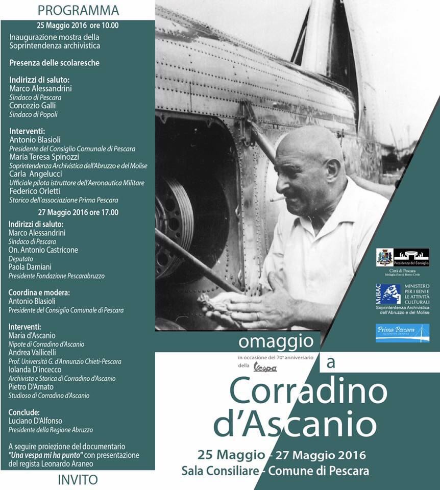 “Abbiamo voluto raccontare un uomo e tutto il suo mondo – dice il presidente del Consiglio Comunale Antonio Blasioli – Lo faremo con chi ne è stato parte integrante, come le nipoti che saranno presenti alla giornata, con degli studiosi come Andrea Vallicelli, docente dell’Università d’Annunzio, Iolanda D’Incecco e Pietro D’Amato, storici di Corradino D’Ascanio. Le conclusioni saranno affidate al presidente della Regione Luciano D’Alfonso. Chiuderà la giornata il documentario “Una vespa mi ha punto” a cura del regista Leonardo Araneo”.