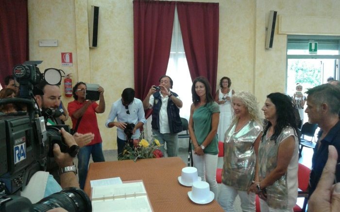 Dietro pero’ c’è anche la storia con la s minuscola, ossia quella privata di due persone che si incontrano, si ascoltano, si piacciono, e finalmente si sposano. tutto nella norma, se non fosse che il loro matrimonio si chiama unione civile e che che le due persone siano dello stesso sesso, donne, nella fattispecie. Il momento storico si è consumato oggi a Spoltore, dove l’ex deputato di Rifondazione Maurizio Acerbo, visibilmente emozionato, ha unito civilmente Margherita Montefalcone e Elena Cornacchia, una di origine milanese e l’altra del pescarese, dipendente pubblica l’una e titolare di una pizzeria l’altra. Ad attenderle nella sala consiliare, oltre al sindaco di Spoltore Luciano Di Lorito e al presidente del consiglio Lucio Matricciani, c’erano più fotografi che invitati, un risvolto mediatico che le due spose non hanno subìto, ma scelto consapevolmente proprio per lanciare un messaggio chiaro e inequivocabile: “Si può fare”. Anche in Italia. Che si possa fare lo ha stabilito la legge Cirinnà, sulla base della quale si è dato corso a questa prima unione civile in terra d’Abruzzo e che da oggi, si spera, vedrà Elena e Margherita sposate come due persone e basta, due donne normali alle quali il cuore non ha posto limiti.