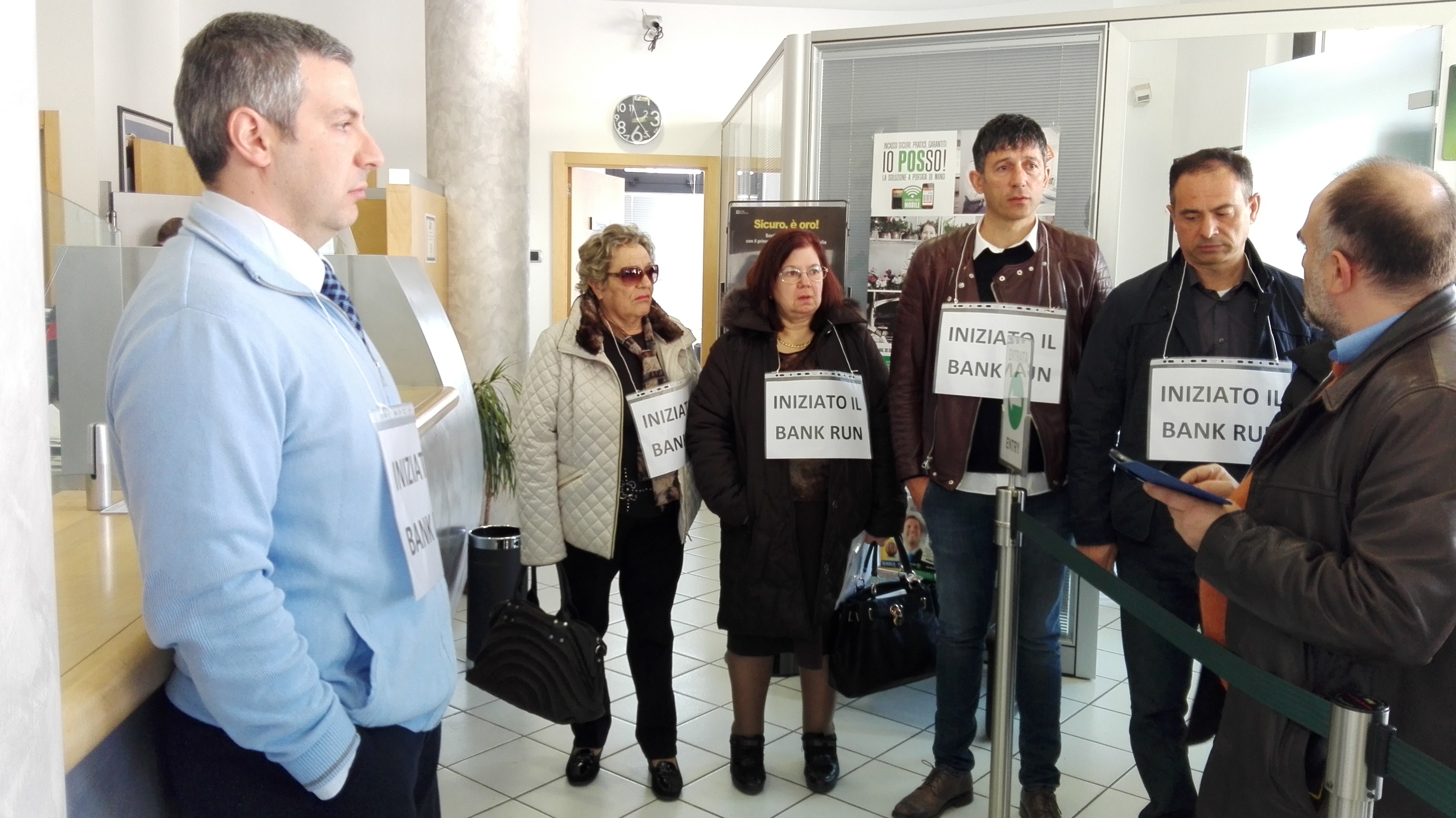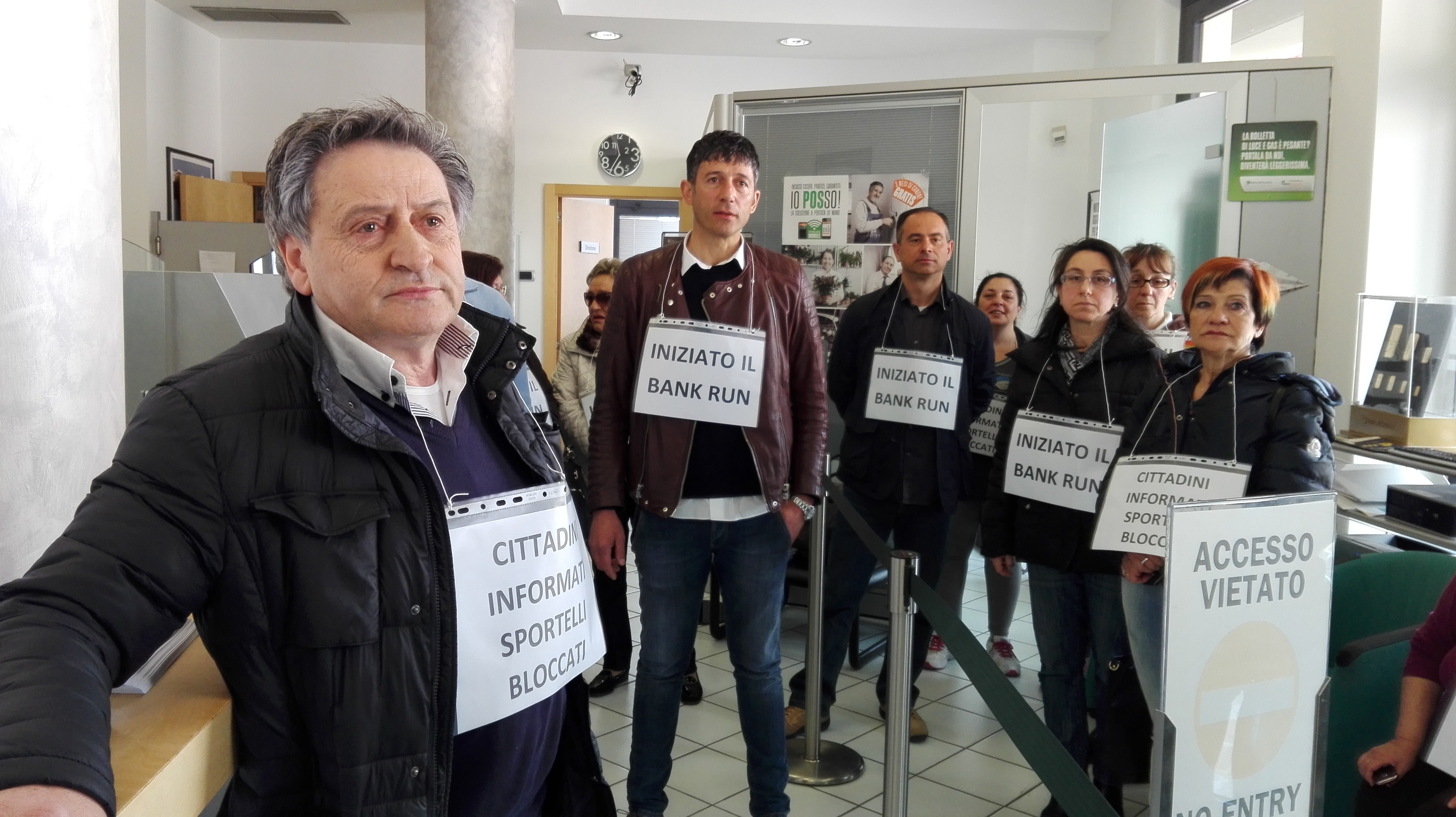 Un gruppo di risparmiatori della Banca Etruria di Pizzoli questa mattina hanno occupato la banca nel centro storico del paese per protestare contro il decreto rimborsi che sarà varato a breve, forse in giornata, dal governo e che non tutela secondo il loro parere i risparmiatori.
