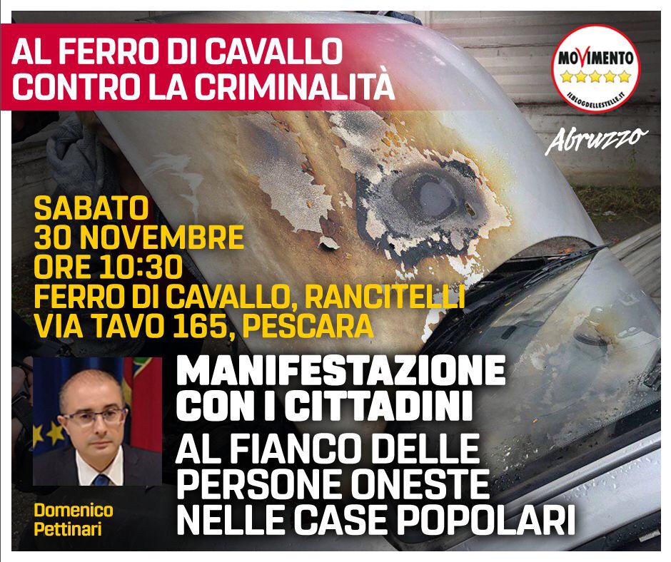 L’appuntamento “Al Ferro di cavallo contro la criminalità” è per sabato 30 novembre, alle 10.30, in via Tavo. Sul posto ci sarà anche Domenico Pettinari, consigliere regionale del Movimento, da sempre impegnato sull’emergenza Rancitelli.