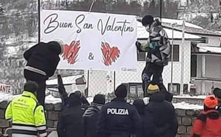 Come tante coppie che si vogliono bene, anche Gianmarco Degni e Valeria Mella oggi avrebbero festeggiato San Valentino: un pensiero d’affetto ha spinto ma gli amici dei dispersi sul Velino ad appendere uno striscione.