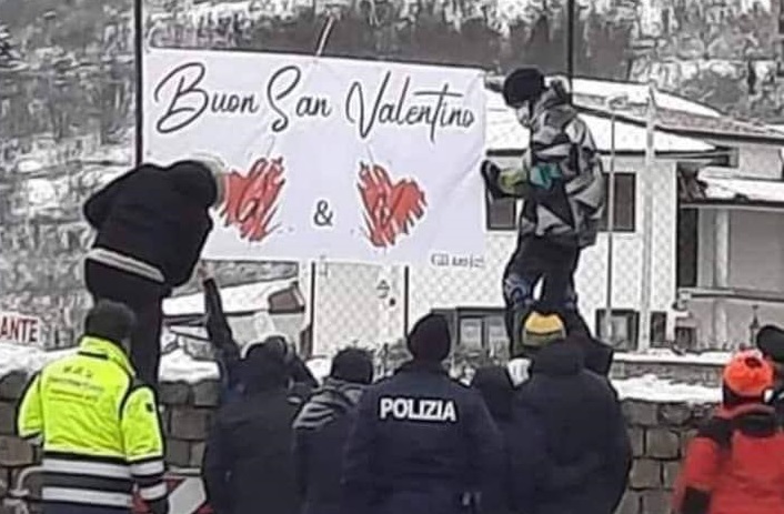 Come tante coppie che si vogliono bene, anche Gianmarco Degni e Valeria Mella oggi avrebbero festeggiato San Valentino: un pensiero d’affetto ha spinto ma gli amici dei dispersi sul Velino ad appendere uno striscione.
