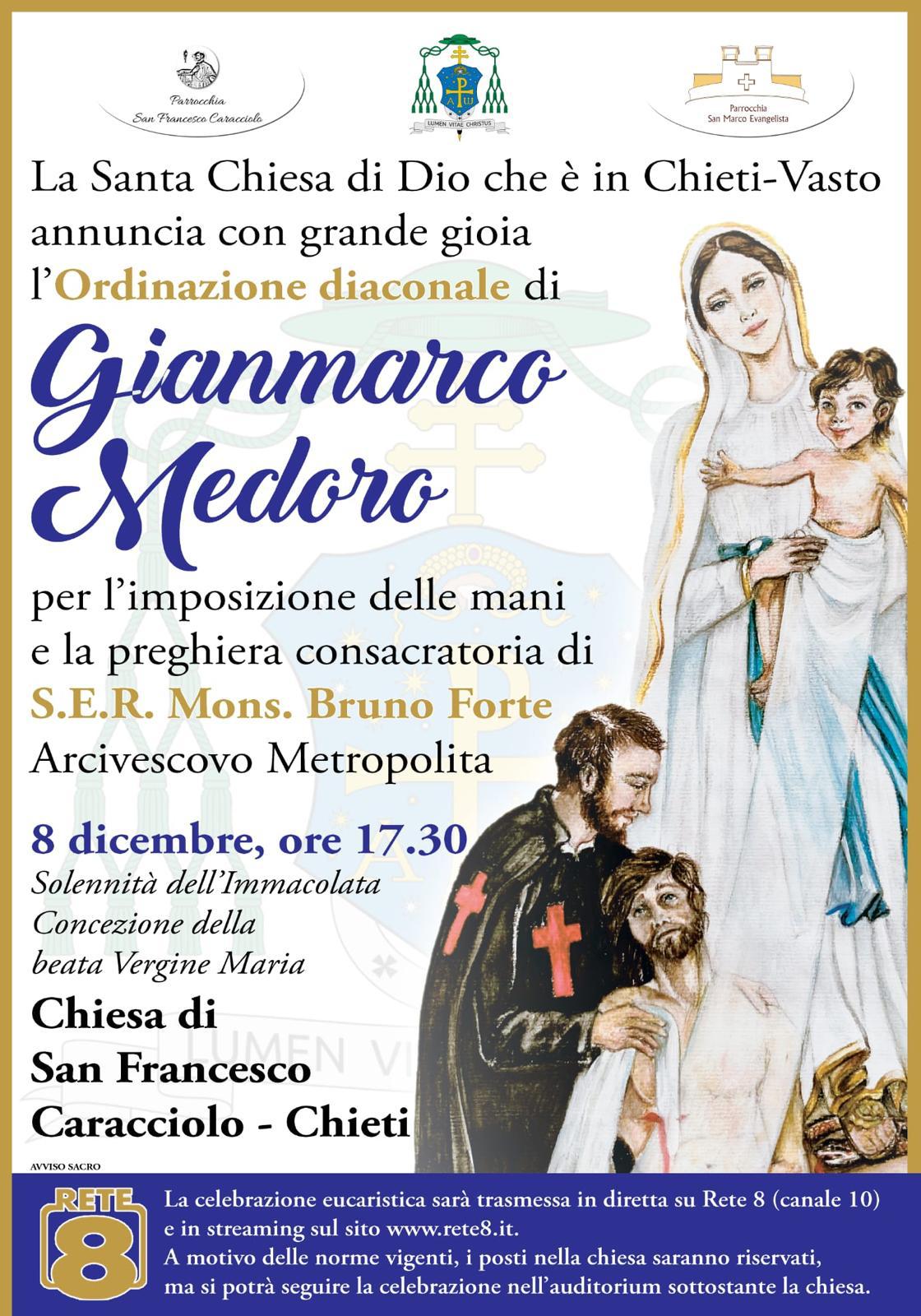 Martedì 8 dicembre, alle 17.30, in occasione della solennità dell’Immacolata Concezione, dalla chiesa San Francesco Caracciolo, sempre a Chieti, Monsignor Forte presiederà l’ordinazione diaconale di Gianmarco Medoro. L’Arcivescovo metropolita interverrà per l’imposizione delle mani e la preghiera consacratoria.