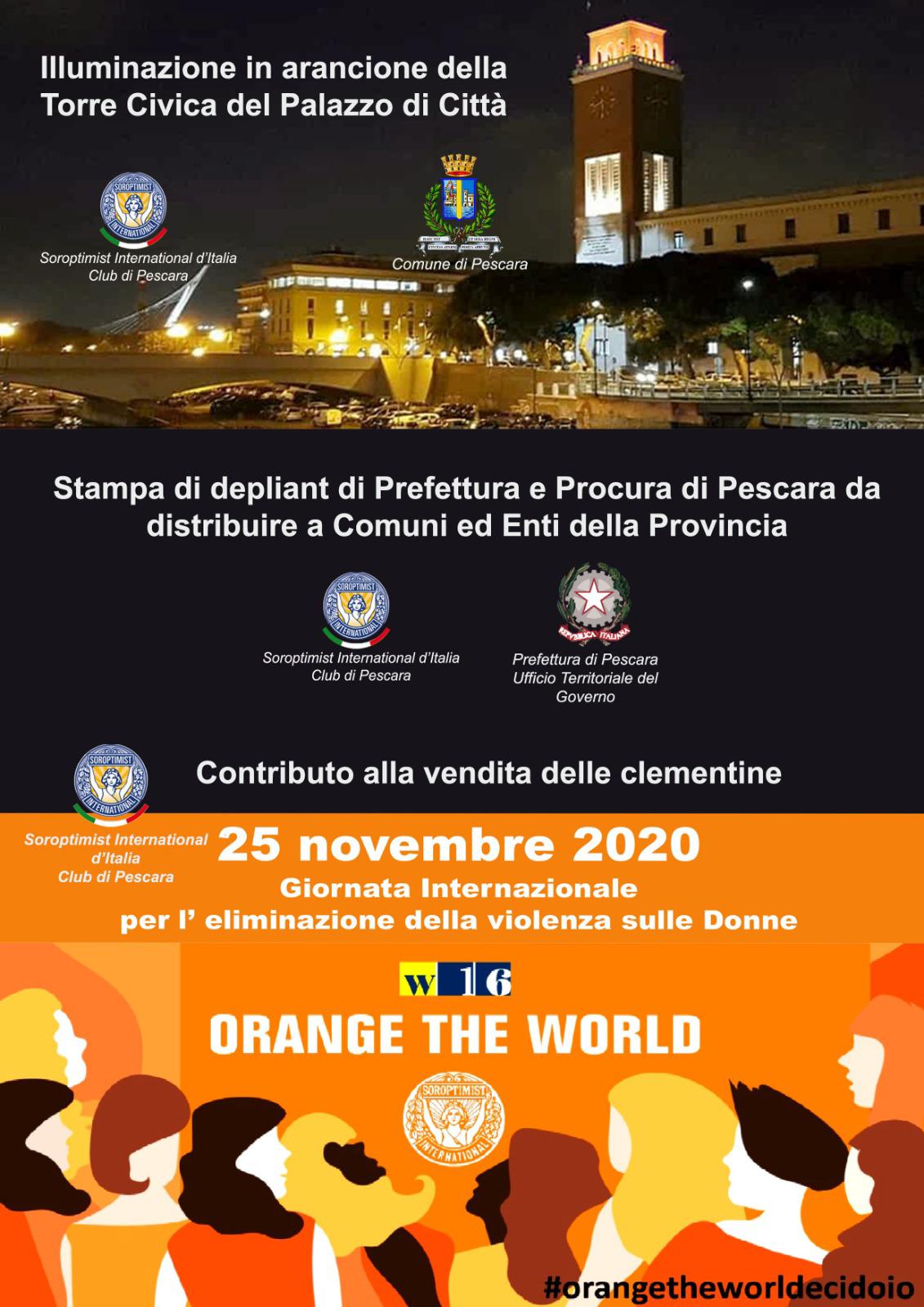 la torre civica di Pescara si colora d’arancione per dire “no” alla violenza sulle donne. Torna infatti “Orange the World”, l’iniziativa sostenuta dal Soroptimist International d’Italia, promossa da UNWomen e dalla Federazione Europea del club service. Dal 25 novembre, Giornata internazionale per dire no alla violenza sulle donne, al 10 dicembre, Giornata internazionale per i diritti umani, che coincide con il Soroptimist Day, si terranno una serie di manifestazioni per sensibilizzare l’opinione pubblica e realizzare iniziative e azioni di divulgazione per un futuro senza violenza di genere, al motto dell’Unione: “DECIDO IO”.