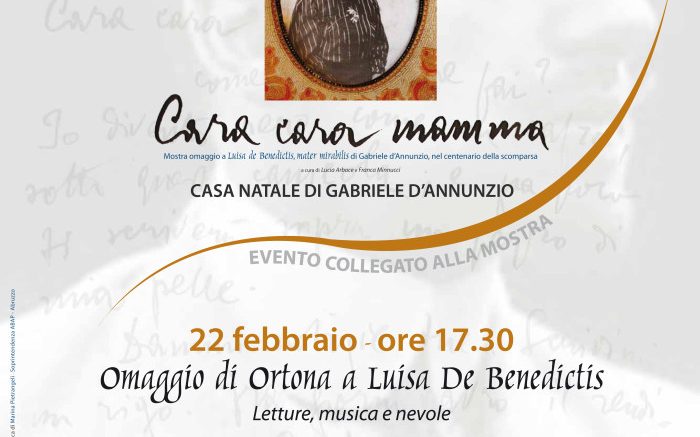 A 100 anni dalla scomparsa, Ortona rende omaggio all’illustre concittadina Luisa de Benedictis, madre di d’Annunzio, nell’ambito della mostra “Cara cara mamma”, il 22 febbraio nella casa natale del Vate, a Pescara.
