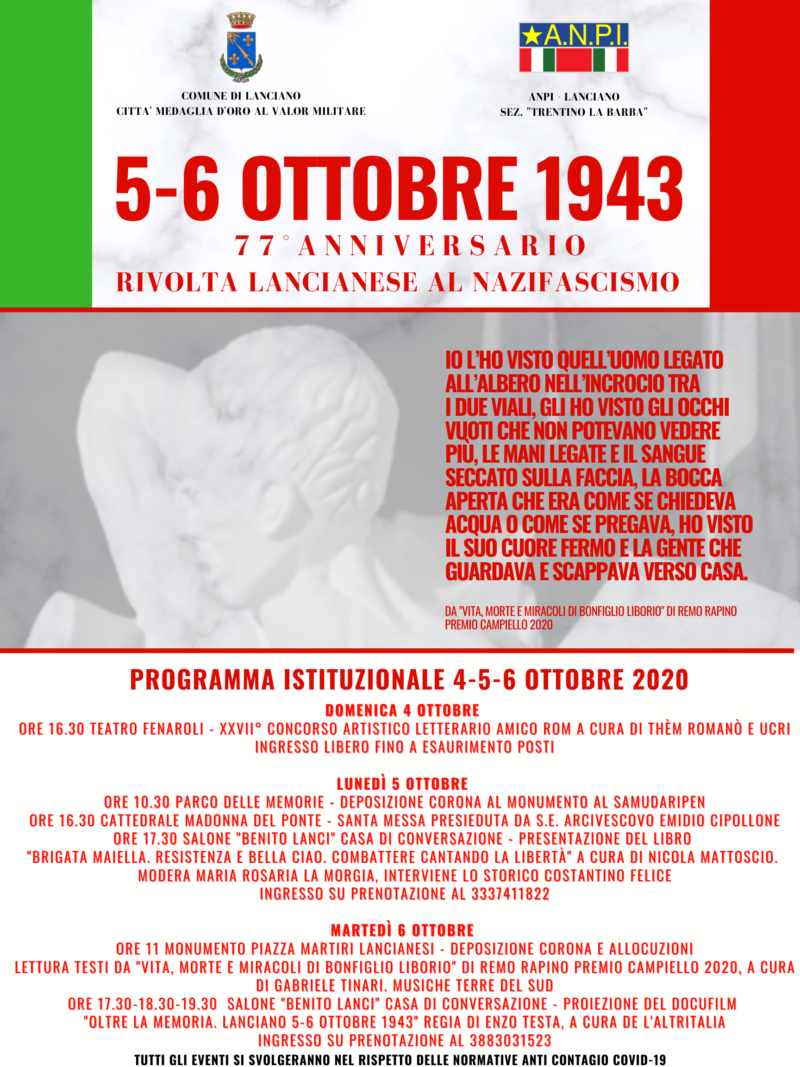 L’amministrazione comunale della Città di Lanciano, Medaglia d’oro al valore militare per la Resistenza, e l’ANPI Lanciano, sezione Trentino La Barba, dal 4 al 6 ottobre organizzano diversi eventi, tutti nel rispetto delle norme anticontagio da covid19, quindi con l’uso obbligatorio della mascherina e il rispetto del distanziamento fisico di almeno 1 metro.