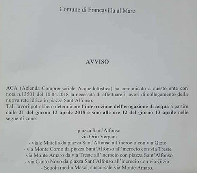 Il sindaco di Francavilla comunica che a causa di lavori dell’Aca potrebbe aversi l’interruzione idrica in alcune zone nei pressi di piazza sant’Alfonso e ha disposto la chiusura per dopodomani della scuola media Masci.
