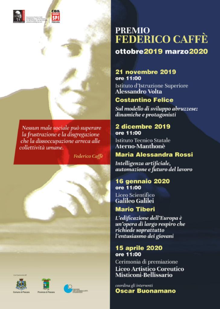 Il Premio Federico Caffè é organizzato dall’omonima Università della LiberEtà in collaborazione con lo SPI-CGIL di Pescara ed è dedicato alla memoria di Giuliano Colazilli, appassionato dirigente della Cgil e dello Spi dell’Abruzzo e cofondatore dell’Università, deceduto il 14 maggio 2016.