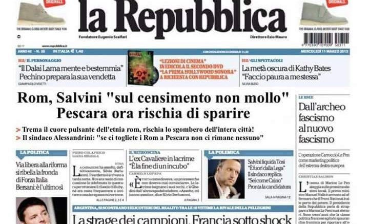 Già qualche tempo fa, in una trasmissione de La7, Pescara era stata definita la città più rom d’Italia e non si è trattato di una boutade ma di una considerazione vera che ha fatto discutere i telespettatori. Dopo l’annuncio di Salvini di voler fare un censimento sui rom, la società civile si è divisa tra indignati e non. Così qualche buontempone ha cercato di smorzare le polemiche e di placare gli animi con il fotomontaggio che vedete, senza voler offendere nessuno rom o non rom. Titolone di Repubblica che ovviamente è un fake ma che vuole sdrammatizzare, strappare qualche sorriso e alimentare lo stesso un dibattito ma dai toni pacati.