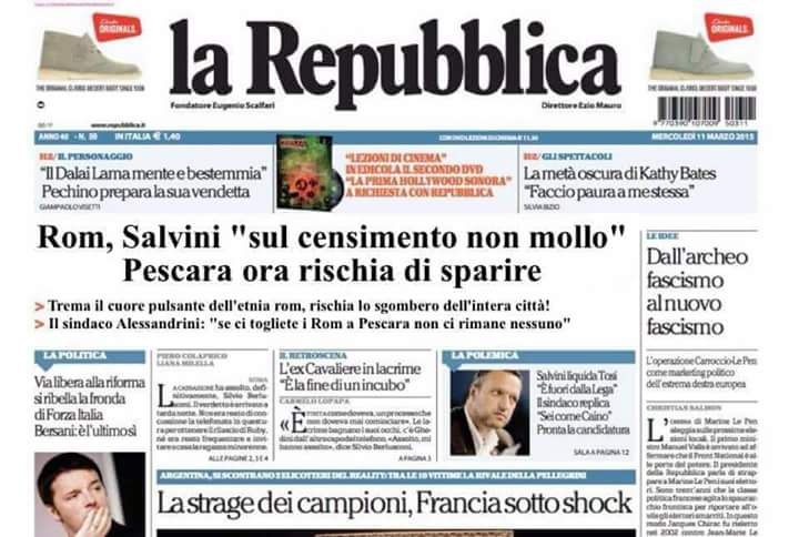 Già qualche tempo fa, in una trasmissione de La7, Pescara era stata definita la città più rom d’Italia e non si è trattato di una boutade ma di una considerazione vera che ha fatto discutere i telespettatori. Dopo l’annuncio di Salvini di voler fare un censimento sui rom, la società civile si è divisa tra indignati e non. Così qualche buontempone ha cercato di smorzare le polemiche e di placare gli animi con il fotomontaggio che vedete, senza voler offendere nessuno rom o non rom. Titolone di Repubblica che ovviamente è un fake ma che vuole sdrammatizzare, strappare qualche sorriso e alimentare lo stesso un dibattito ma dai toni pacati.