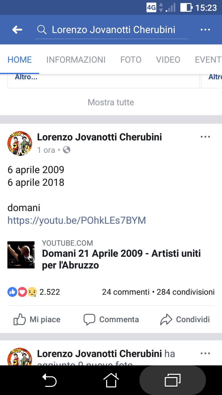 Un messaggio sobrio sulla bacheca di Lorenzo Cherubini Jovanotti, il quale non ha dimenticato l’anniversario del terremoto del 2009 che colpì L’Aquila e altri centri abruzzesi con 309 vittime. Jovanotti, da sempre impegnato in campagne sociali e di solidarietà, ha ripubblicato il brano “Domani” al quale hanno partecipato anche altri artisti, all’indomani del sisma. Tanti i messaggi di affetto dei fan di Jovanotti che lo hanno ringraziato per questa dedica speciale e composta. Per non dimenticare. Anche diversi artisti che hanno interpretato il brano si sono uniti al ricordo di Lorenzo che più volte, per i suoi concerti, è stato nella nostra regione.