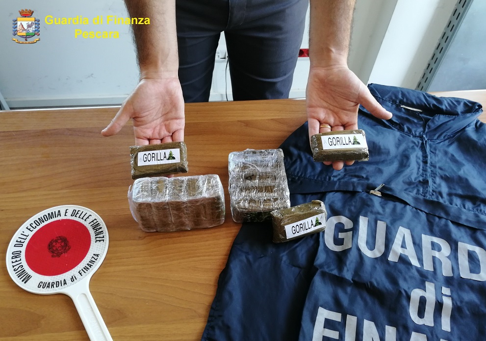 Guardia di Finanza Pescara: arrestato uno spacciatore, sequestrato 1,5 kg. di hashish. La droga, di “ottima qualità” proveniente dalla Spagna e destinata al consumo nel capoluogo adriatico, avrebbe fruttato agli spacciatori al minuto, più di 15.000,00 Euro.