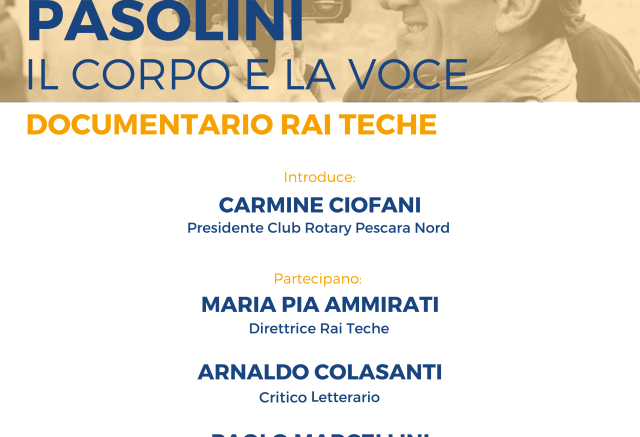 Il docufilm di Rai Teche , di Maria Pia Ammirati, Arnaldo Colasanti e Paolo Marcellini, sarà al centro dell’incontro “Pasolini, il corpo e la voce”, organizzato dal Rotary club Pescara Nord all’auditorium Petruzzi, venerdì 18 novembre. L’incontro, che inizierà con i saluti del presidente del Club Rotary Pescara Nord, Carmine Ciofani e proseguirà con gli interventi della stessa Maria Pia Ammirati, direttrice di Rai Teche, del critico letterario Arnaldo Colasanti, del regista Paolo Marcellini, e del docente dell’Università d’Annunzio, Ugo Perolino.
