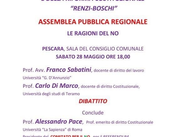 Allo stesso modo sia la Rai che i media compiacenti, secondo Pace, adottano un comportamento che limita fortemente i diritti delle opposizioni. Il comitato per il No sta raccogliendo le firme per bloccare la “violenza sulla Costituzione” e abrogare lo “scandaloso” premio di maggioranza e i capilista bloccati di quello che definisce “l’altro capolavoro antidemocratico”, ossia la legge elettorale disegnata con Berlusconi e Verdini. Oggi Pace, professore emerito di diritto costituzionale all’Università “La Sapienza” di Roma e presidente nazionale del Comitato per il No, sarà a Pescara per supportare il Comitato regionale per il No. Presenti anche l’avvocato Franco Sabatini, docente diritto del lavoro Università G. D’Annunzio e referente regionale, e il professor Carlo Di Marco, docente di diritto Costituzionale all’Università degli studi di Teramo. L’incontro, aperto alla cittadinanza, si terrà nel pomeriggio, presso la sala consiliare del comune di Pescara, a partire dalle ore 18. L’assemblea pubblica regionale è stata organizzata per illustrare le ragioni del No al Referendum costituzionale e i pericoli della Legge elettorale Italicum.
