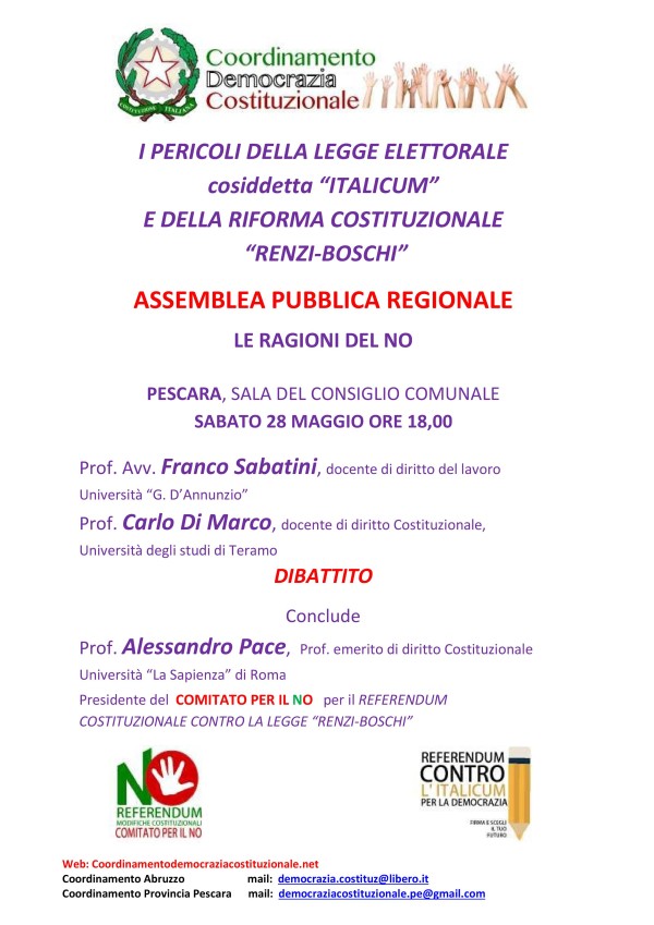 Allo stesso modo sia la Rai che i media compiacenti, secondo Pace, adottano un comportamento che limita fortemente i diritti delle opposizioni. Il comitato per il No sta raccogliendo le firme per bloccare la “violenza sulla Costituzione” e abrogare lo “scandaloso” premio di maggioranza e i capilista bloccati di quello che definisce “l’altro capolavoro antidemocratico”, ossia la legge elettorale disegnata con Berlusconi e Verdini. Oggi Pace, professore emerito di diritto costituzionale all’Università “La Sapienza” di Roma e presidente nazionale del Comitato per il No, sarà a Pescara per supportare il Comitato regionale per il No. Presenti anche l’avvocato Franco Sabatini, docente diritto del lavoro Università G. D’Annunzio e referente regionale, e il professor Carlo Di Marco, docente di diritto Costituzionale all’Università degli studi di Teramo. L’incontro, aperto alla cittadinanza, si terrà nel pomeriggio, presso la sala consiliare del comune di Pescara, a partire dalle ore 18. L’assemblea pubblica regionale è stata organizzata per illustrare le ragioni del No al Referendum costituzionale e i pericoli della Legge elettorale Italicum.