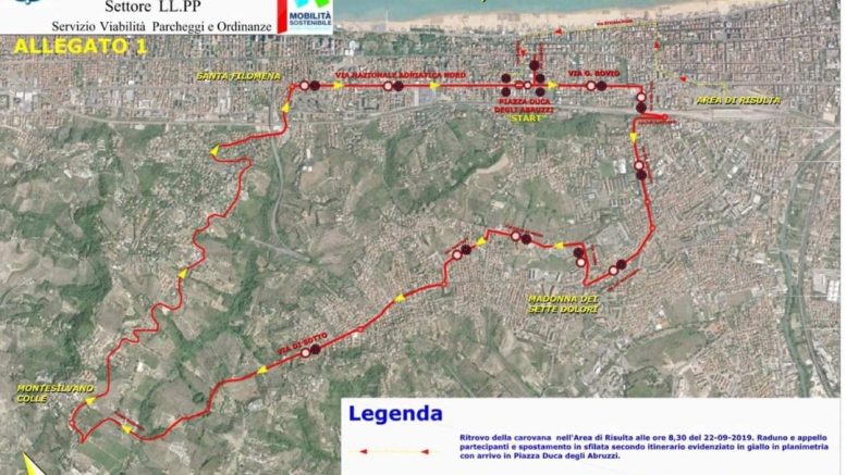 ⏱ dalle ore 8,30 alle ore 11,30 nel giorno del 22/09/2019 sul seguente tracciato stradale: Area di Risulta, Via Leopoldo Muzii, Viale Riviera Nord, Via Cavour, Via A. Diaz, Via Cadorna, Piazza Duca degli Abruzzi;