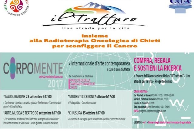 La no profit che supporta le attività della Unità Operativa di Radioterapia Oncologica dell’ospedale clinicizzato di Chieti promuove un’altra iniziativa nell’ambito della mostra CORPOMENTE: Arte & Medicina lavorano, in programma presso la Pinacoteca della Camera di Commercio, in Piazza G.B. Vico dal 23 settembre al 15 ottobre. Sabato 7 ottobre, con inizio alle ore 18.00, concerto di clavicembalo del Maestro Fabio D’Orazio. Anche in questa occasione continueranno le visite guidate all’interno della mostra CORPOMENTE: Arte & Medicina lavorano, promossa dalla onlus “Il Tratturo – Una strada per la vita”.