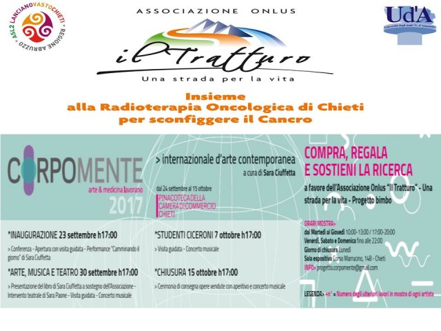 La no profit che supporta le attività della Unità Operativa di Radioterapia Oncologica dell’ospedale clinicizzato di Chieti promuove un’altra iniziativa nell’ambito della mostra CORPOMENTE: Arte & Medicina lavorano, in programma presso la Pinacoteca della Camera di Commercio, in Piazza G.B. Vico dal 23 settembre al 15 ottobre. Sabato 7 ottobre, con inizio alle ore 18.00, concerto di clavicembalo del Maestro Fabio D’Orazio. Anche in questa occasione continueranno le visite guidate all’interno della mostra CORPOMENTE: Arte & Medicina lavorano, promossa dalla onlus “Il Tratturo – Una strada per la vita”.