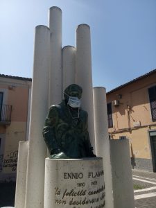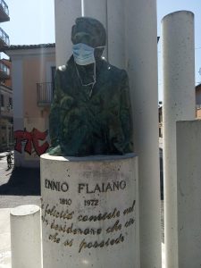 La pandemia non porta solo dolore e difficoltà quotidiane, che ovviamente hanno il massimo rispetto di tutti, ma stimola anche la creatività degli artisti o dei semplici cittadini. In questo periodo, per esempio, in tante città del mondo c’è chi ha pensato di mettere la mascherina anche alle statue, persino a quelle enormi. Nel nostro piccolo, anche Pescara partecipa a questo gioco: qualcuno ha messo la mascherina al busto di uno dei simboli culturali della città, Ennio Flaiano. Giusto il tempo dello scatto e poi via. Ma è probabile che nemmeno se fosse vissuto all’epoca del Coronavirus lo scrittore, seppure mascherato, avrebbe perso le parole e la capacità lucida e caustica di analizzare la realtà.