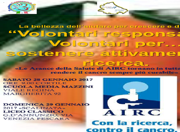 “In un periodo in cui educare alla solidarietà è tutt’altro che scontato – afferma Carla Antonioli, presidente Scienza Under 18 Pescara per l’Abruzzo – bisogna potenziare l’adesione ai gesti che vanno in questa direzione. Il nostro intento è trasformare i banchi di scuola in laboratori in cui crescere e diventare tutor di pratiche “sensate” da trasferire agli adulti. La collaborazione della nostra associazione con il Comitato AIRC Abruzzo e Molise è storica: con la presidente Maria Francesca De Cecco organizziamo diversi appuntamenti rivolti agli studenti, stimolandoli a scoprire la bellezza dell’aiutare e a diventare “volontari responsabili”. Domani, 28 gennaio 2017, nell’ambito della manifestazione “Cancro io ti boccio”, nel cortile della scuola secondaria di I grado Mazzini, in viale Regina Margherita, allestiremo un gazebo per la distribuzione delle arance della salute. Il giorno successivo l’iniziativa sarà portata davanti al Liceo Classico, in via Venezia”.