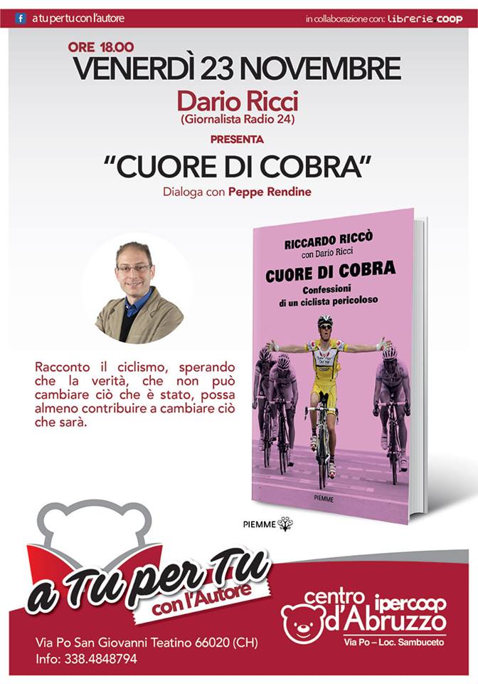 Continuano gli appuntamenti inseriti nella rassegna “A tu per tu con l’autore”, promossa dal Centro d’Abruzzo di Sambuceto (San Giovanni Teatino, provincia di Chieti) in collaborazione con la Libreria Coop. Oggi, alle 18, in libreria verrà presentato “Cuore di Cobra, confessioni di un ciclista pericoloso” di Riccardo Riccò e Dario Ricci. La vicenda del ciclista Riccò ricorda in qualche modo quella di Marco Pantani: Riccò è un ex ciclista su strada italiano, squalificato per doping fino al 2024. Soprannominato Il Cobra, nel 2008 si aggiudicò la vittoria di due tappe al Giro d’Italia, che concluse al secondo posto. Noto per le sue denunce sulla presenza del doping nel mondo del ciclismo, Riccò racconta se stesso all’autore, Dario Ricci.