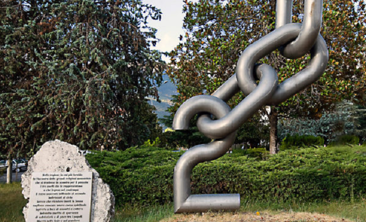 La fiaccola sarà posizionata alla base della scultura “2000 & beyond”, realizzata dal sulmonese Franco Iezzi, in occasione del ventennale della posa a Bethlehem dell’opera situata anche a Sulmona. La cerimonia si svolgerà alle 12.30 a Bethlehem in Manger Street (Strada della Mangiatoia) e a Sulmona in Piazza Capograssi. La scultura fu realizzata, su richiesta di Papa Giovanni Paolo II, tramite il Cardinale Vincenzo Fagiolo, il quale, a conoscenza dell’impegno di Iezzi in Palestina, gli propose di ideare una scultura da installare a Bethlehem, per celebrare a un tempo il Grande Giubileo del 2000, il legame fra le tre religioni monoteiste (rappresentato dai tre anelli della catena) e l’anelito alla Pace (gli anelli che si sostengono in alto contro la legge di gravità).