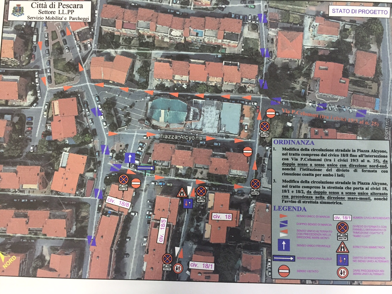 Pescara, modificata la viabilità in Piazza Alcyone. E’ stata firmata l’ordinanza che prevede un cambio nella viabilità nel complesso di villaggio Alcyone a Pescara. Il sopralluogo svolto dagli assessori Blasioli e Civitarese, segue una segnalazione pervenuta da alcuni residenti, che hanno lamentato come l’attuale conformazione stradale e il doppio senso di circolazione, avesse impedito più volte lo stesso transito dei mezzi di soccorso.