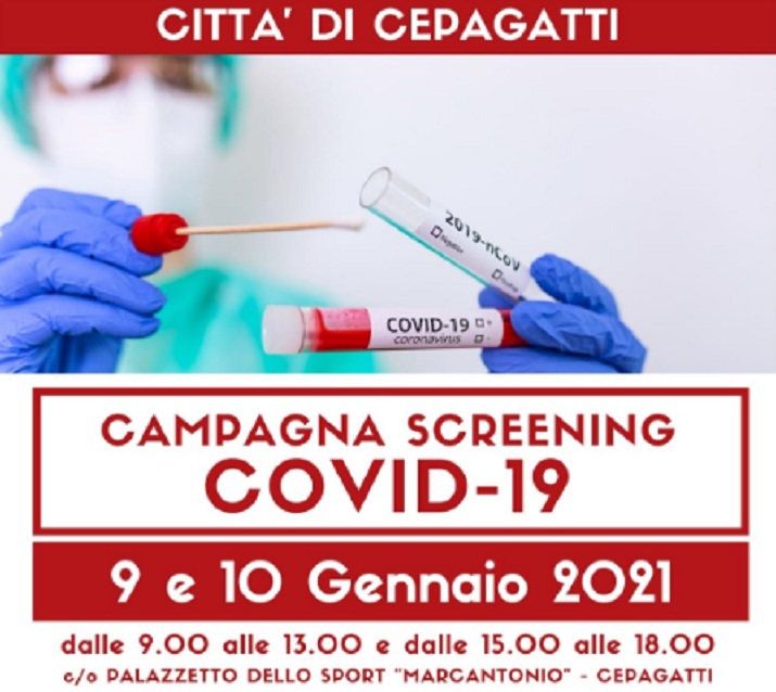 Il Comune di Cepagatti su invito della Asl e in collaborazione con la Croce Rossa e la Protezione Civile ha organizzato il week end di screening che si svolgerà sabato 9 e domenica 10 gennaio dalle 9 alle 13 e dalle 15 alle 18 presso il palazzetto dello Sport di Cepagatti -via Dante Alighieri. Non è necessario prenotarsi e possono partecipare tutti i cittadini residenti e domiciliati sul territorio con età maggiore a 6 anni.
